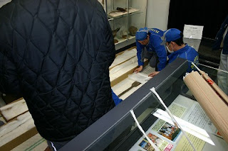 本日午前中は、普段はミュージアム本館展示室で常設展示している縄文前期の櫂2本とヤスの柄1本の貸し出し作業がありました。